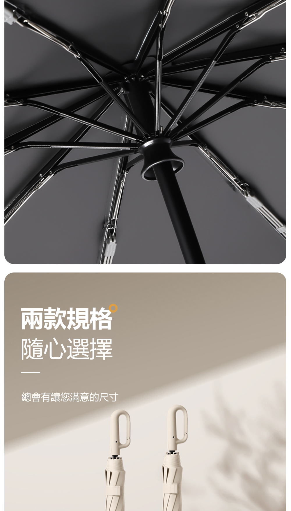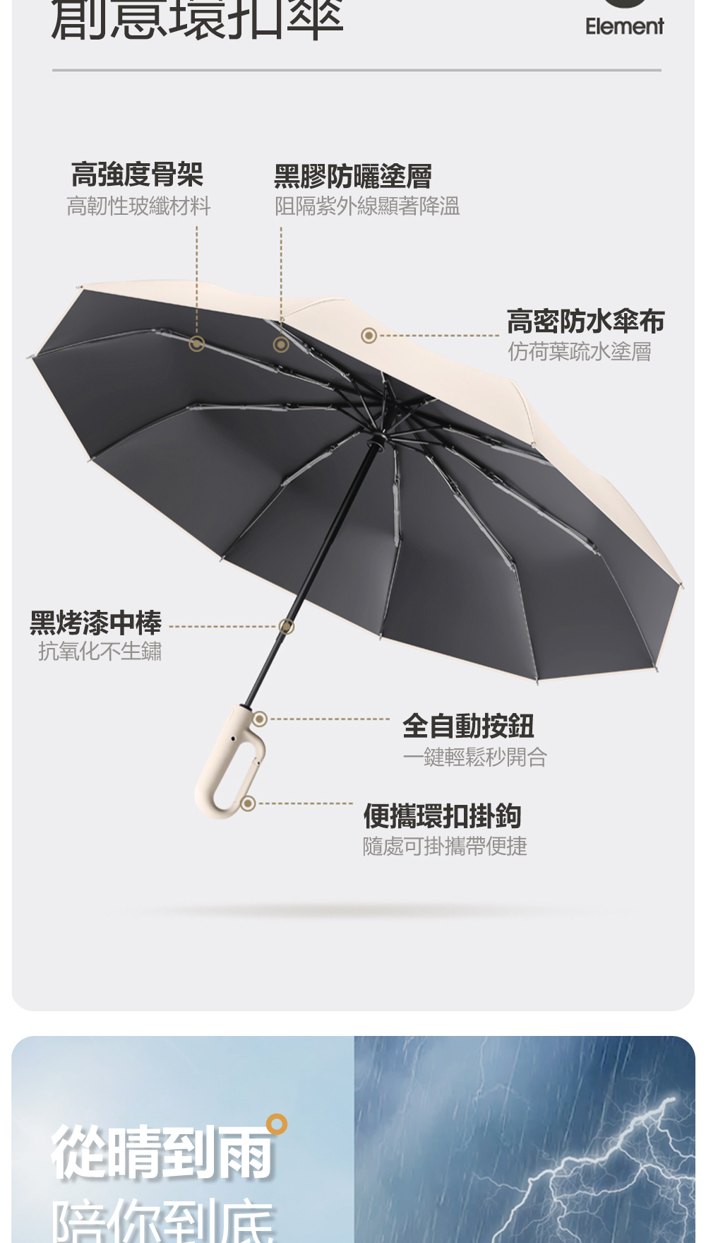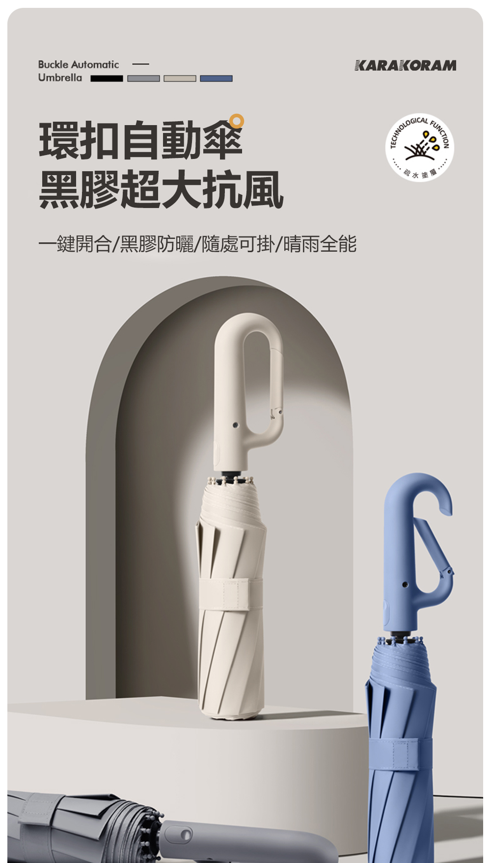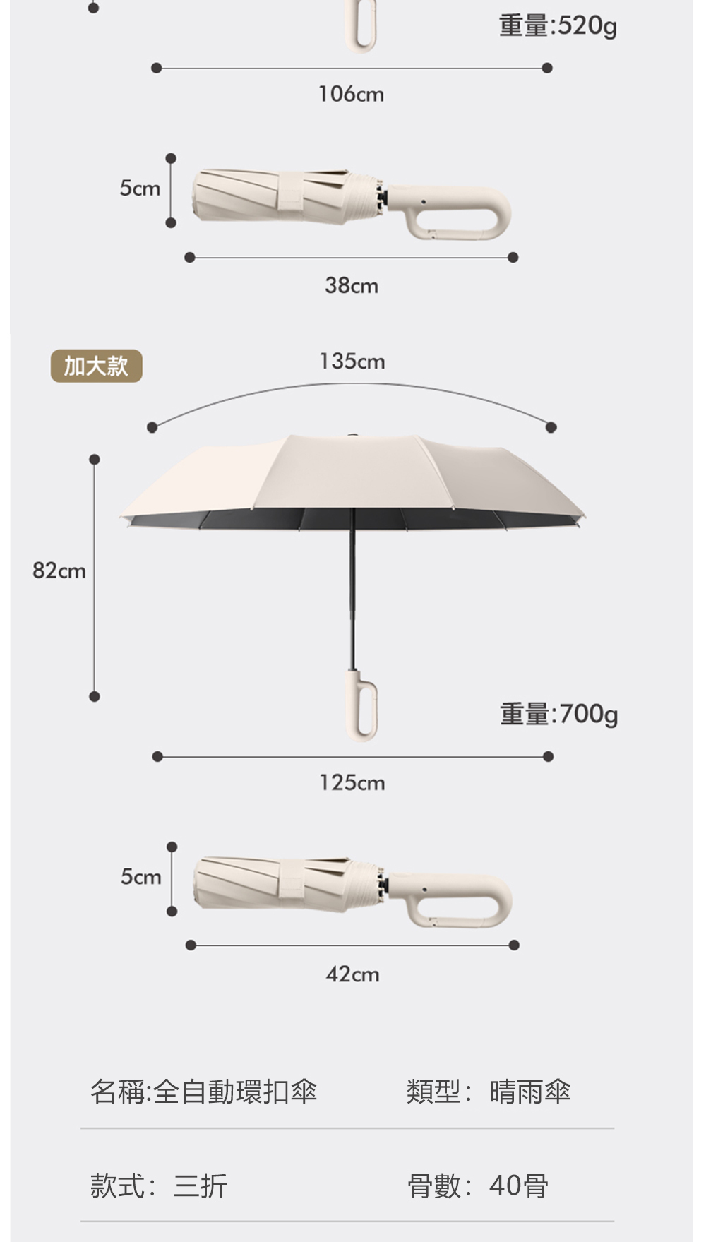 UPF50+ 晴雨兩用環扣自動傘,加大傘面,可遮蔽3-4人,360全方位遮護,多人同行不濕身,雙纖維龍骨,能承受10kg拉力,無懼大風大雨