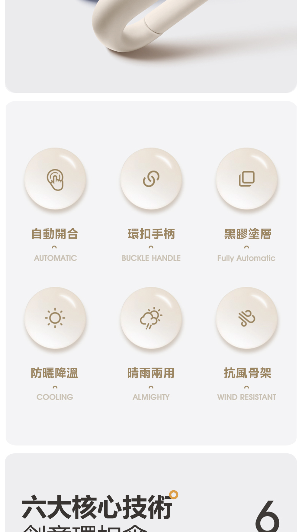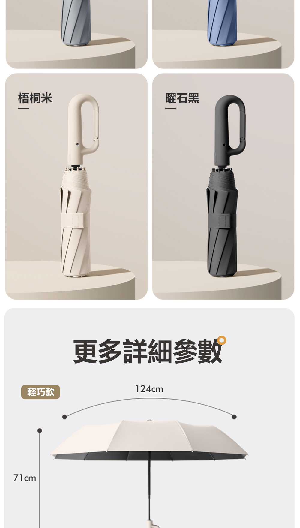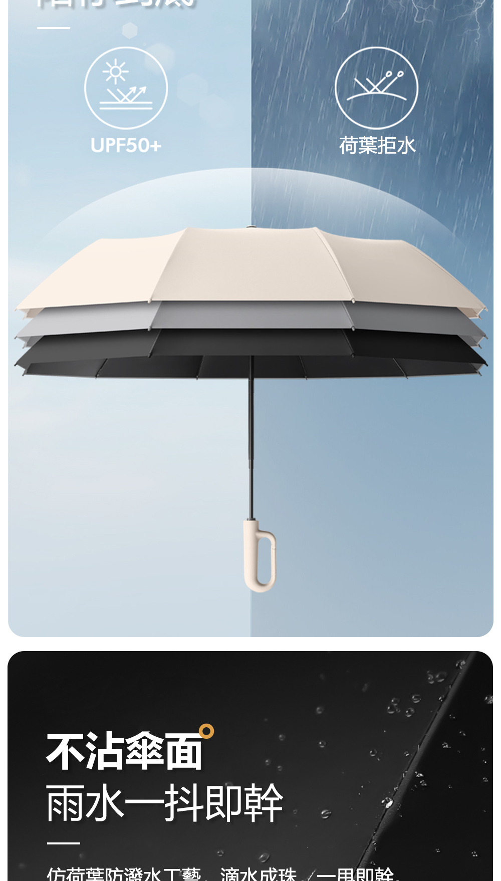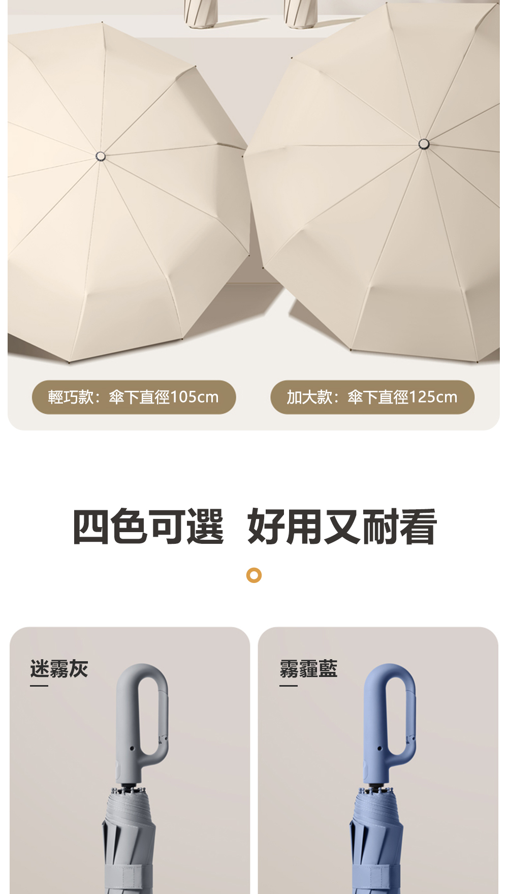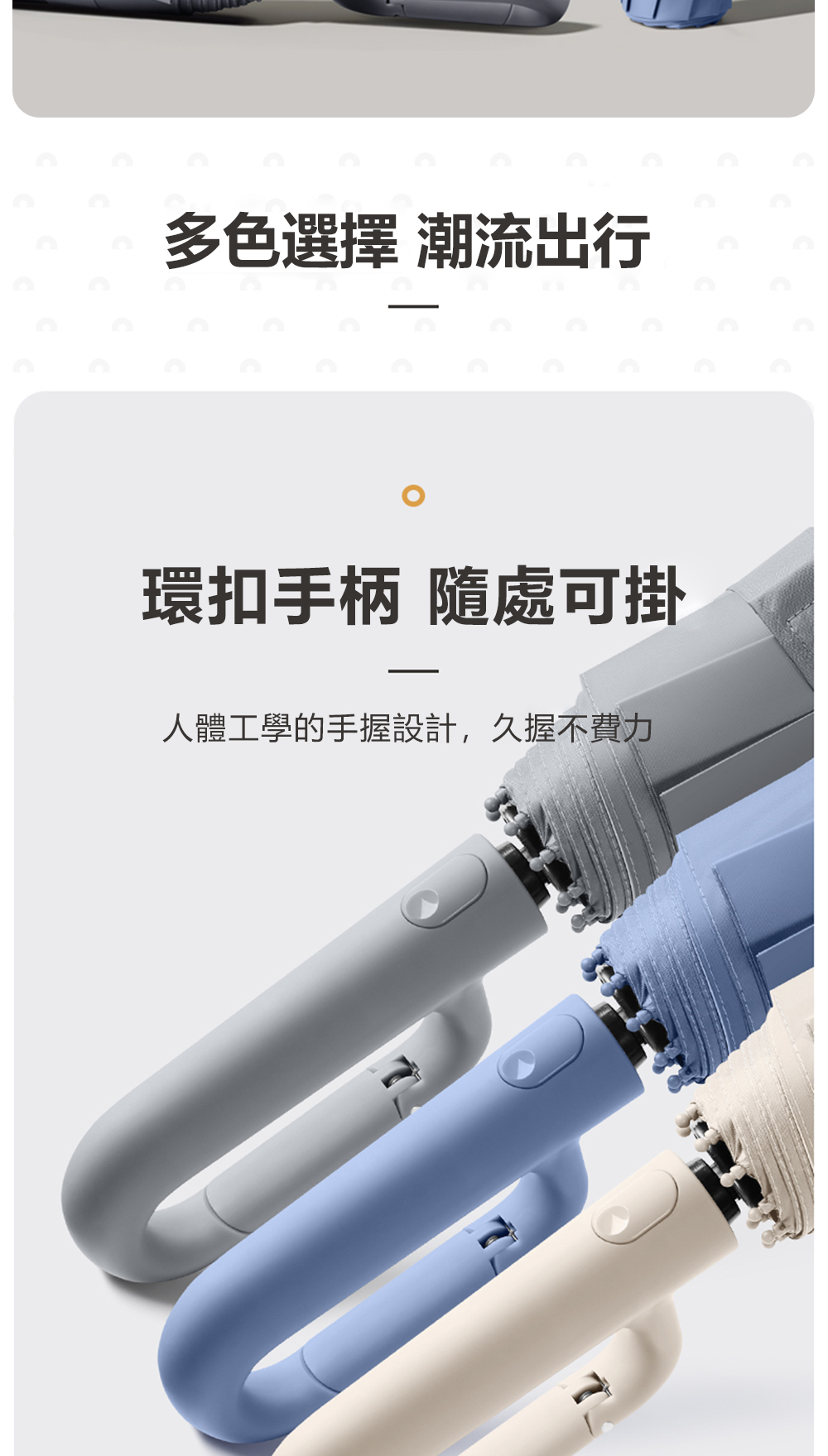 UPF50+ 晴雨兩用環扣自動傘,加大傘面,可遮蔽3-4人,360全方位遮護,多人同行不濕身,雙纖維龍骨,能承受10kg拉力,無懼大風大雨